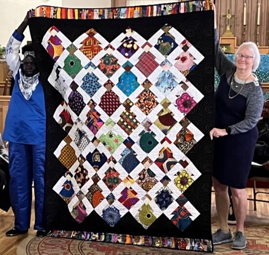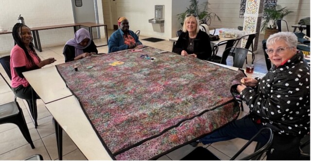 An “African Sisters” quilt was completely pieced and quilted by RefugeeNet members and hangs in the community room at St. Luke’s Episcopal church in North Park, where many refugee activities take place.